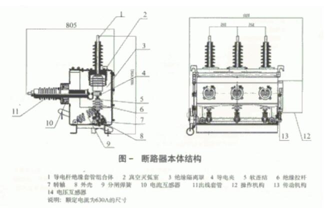 斷路器本體部分由導電回路,絕緣體系,密封件和殼體組成。全體結構為三相共箱式。其間導電回路由進出線導電桿,進出線絕緣支座,導電夾,軟聯接與真空滅弧室聯接而成。