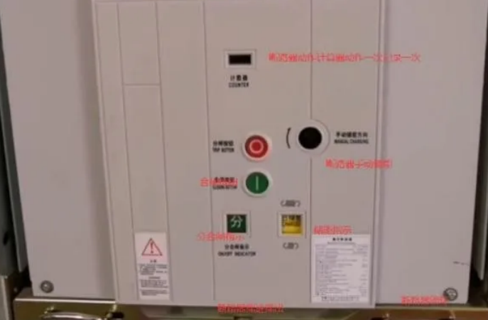 1,斷路器在分閘已儲能狀態,儲能指示顯示已儲能,儲能彈簧已拉開,面板得合閘按鈕在上圖中的下孔中,如果斷路器未儲能是合不了閘的