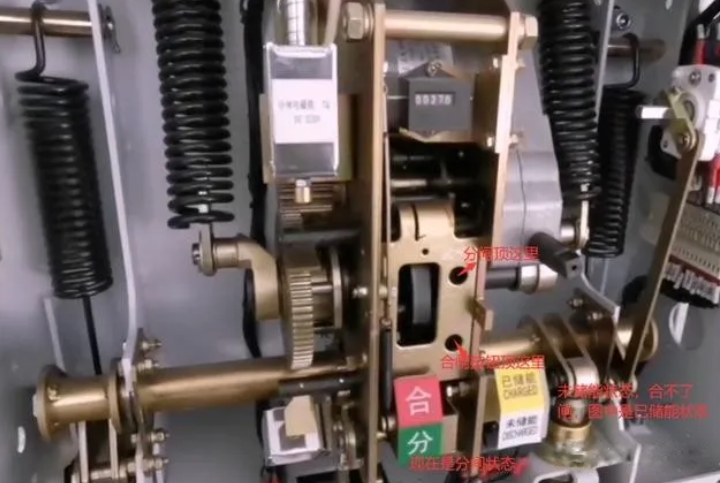 2,按下合閘按鈕后,合閘指示牌顯示在合閘位置。儲能顯示在未儲能狀態,未儲能是可以分閘的,分閘的釋放彈簧是拉開的,按下分閘按鈕,分合閘指示牌顯示已分閘,這是在未儲能狀態按合閘按鈕是合不了閘的,合閘必須要儲能,