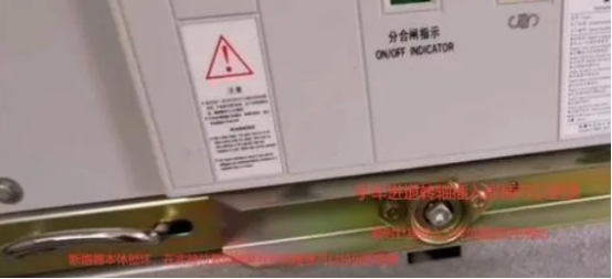 6,上圖為斷路器本體鎖環,圖中為斷路器試驗方位,從檢修方位推入試驗方位時,把兩頭鎖環往中心推把鎖環翻開,推入到試驗方位時,松開鎖環鎖環就翻開鎖在試驗方位,當要從試驗方位推入到工作方位時,將兩頭鎖環往中心推翻開鎖環,這時順時針搖入斷路器到工作方位。