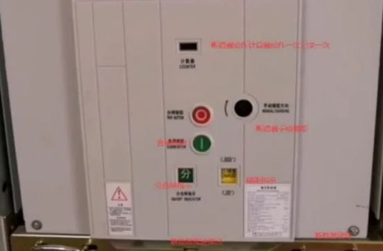 1,斷路器在分閘已儲能情況,儲能指示閃現(xiàn)已儲能,儲能彈簧已擺開,面板得合閘按鈕在上圖中的下孔中,假設(shè)斷路器未儲能是合不了閘的